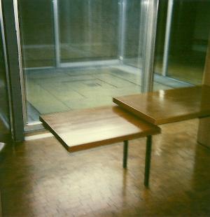 Rahmen gehalten von Metallstützen, eine Platte ist fest, eine Platte ist drehbar. |