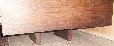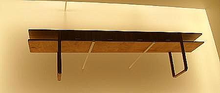 | Eine Arbeit aus Holz mit zwei schwebenden Platten und vier Schubladen auf zwei Holzkufen. |