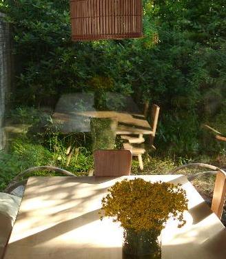 Bauhausgedanken nahe, ausgeführt in Holz, Stoff und Korbgeflecht.